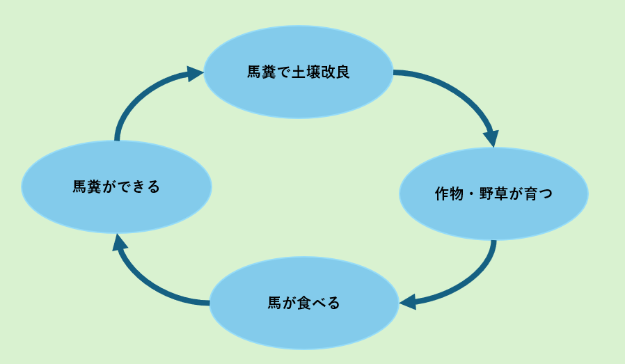 馬糞で土が育ち、作物や野草が育つ。育った野草を馬が食べて馬糞ができる。